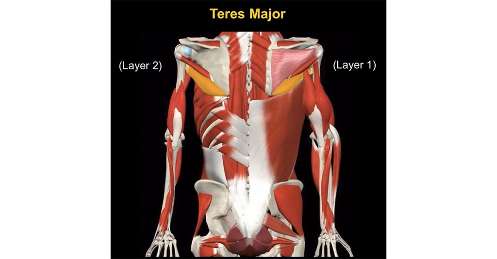 Anatomy: As you can see in the anatomy graphic (see first image below), the Teres Major sits on the lateral aspect (side) of the upper back, just under the shoulder joint, and attaches on the humerus, making up a significant portion of the “upper-outer” back (also, it can be much larger proportionally than it appears in that graphic if trained).