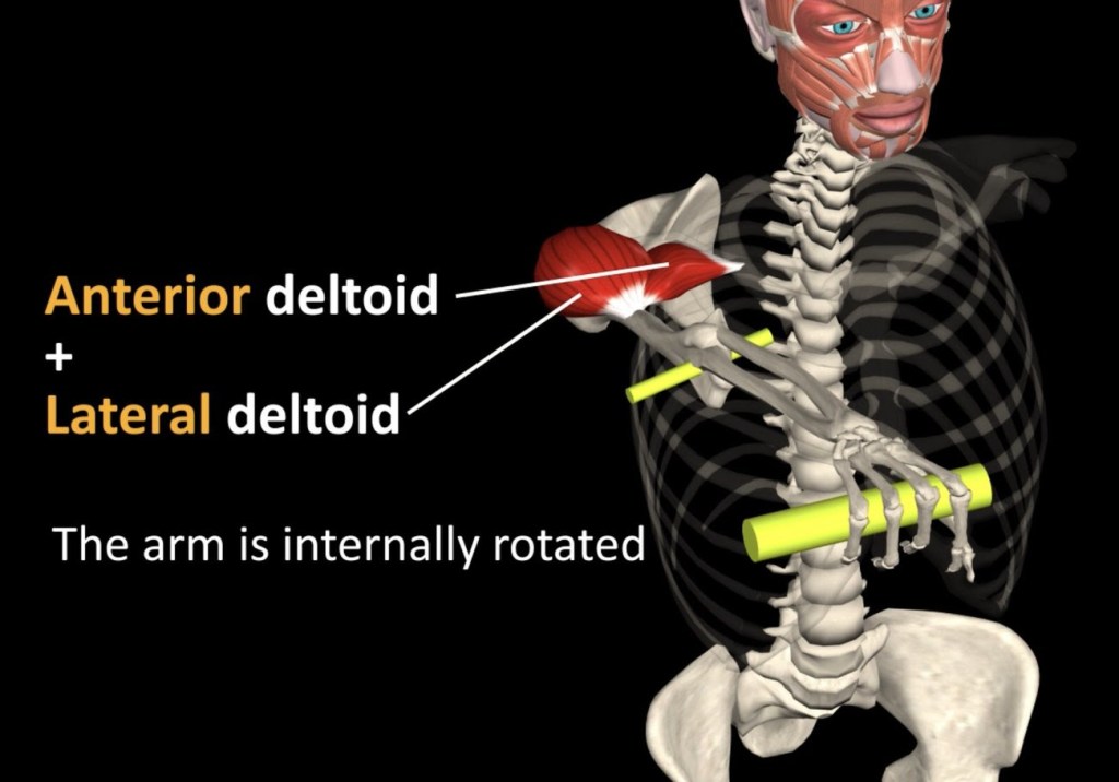 THE ANATOMY: In order to target the anterior deltoid, which is situated on the very front of the shoulder, with a front raise, the anterior deltoid needs to be ON TOP, so that it’s pulling directly up on the humerus! With a pronated forearm – and thus an internally rotated shoulder – you’re placing the lateral (side)deltoid on top, not the anterior! (see 2nd pic below) Even worse, flexing the shoulder forward while having the joint internally rotated is also a recipe for rotator cuff tears and impingement! With a neutral forearm, your shoulder is a little more externally rotated, so the lateral and anterior deltoid heads are pretty evenly spaced on top of the arm, and both pull up equally (see 3rd pic below), making it “okay” at hitting the anterior deltoid, and at least a lot more safe and healthy for the joint than the pronated version. However, a supinated forearm externally rotates the shoulder further, placing the anterior deltoid squarely on top (no pic), so that it’s the only deltoid head pulling up on the arm, making it by far the most effective front raise for working the anterior deltoid!!