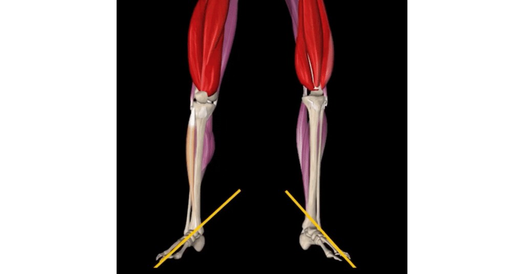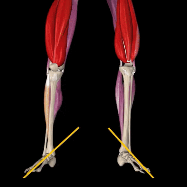 Most people know that your feet should be about shoulder or hip width apart from each other… but not that your toes and knees should NOT be pointing straight ahead! Instead, they should both be angled OUT (laterally rotated) to around 15-25 degrees! (See GIF below – no need to be exact with the angle – anything between 10-40 will work for most people. Try it out with light weight first and you’ll get a feel for what angle is best for you.)