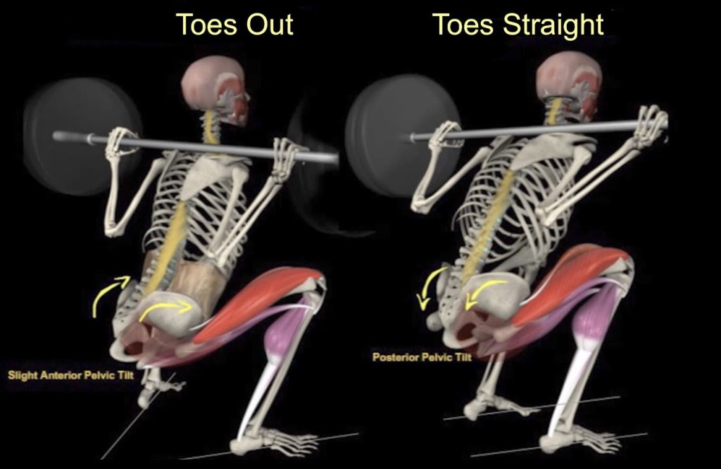 The main reason for this is that having your toes and knees turned out gives your pelvis room to tilt anteriorly (see left side of pic below), which is necessary to keep your back straight as you squat down. Having your toes and knees straight forces your pelvis into a more posteriorly tilted position(see right side of pic below), which ultimately puts an unhealthy amount of stress on your spine, significantly increasing the risk of injury.