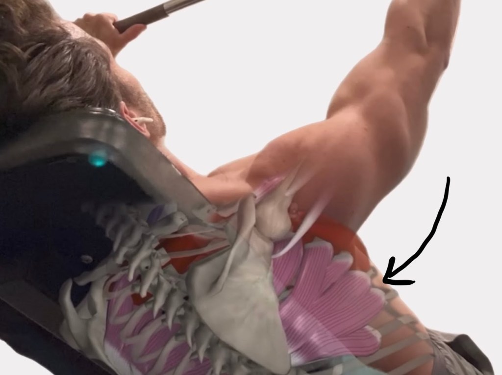 The serratus anterior also engaged in standard “push” type exercises, such as the bench press (see image #3 below).but only as a tertiary agonist at best. The pecs, anterior deltoids, and triceps take the vast majority of the load. So to really develop your serratus anterior, you need to target it directly via a wide variety of isolation exercises! You can check out more examples in this YouTube video I published a while ago on the serratus anterior.. and you’ll find even more techniques – along with how to properly integrate them into a comprehensive workout routine – in my Total Core Programs!