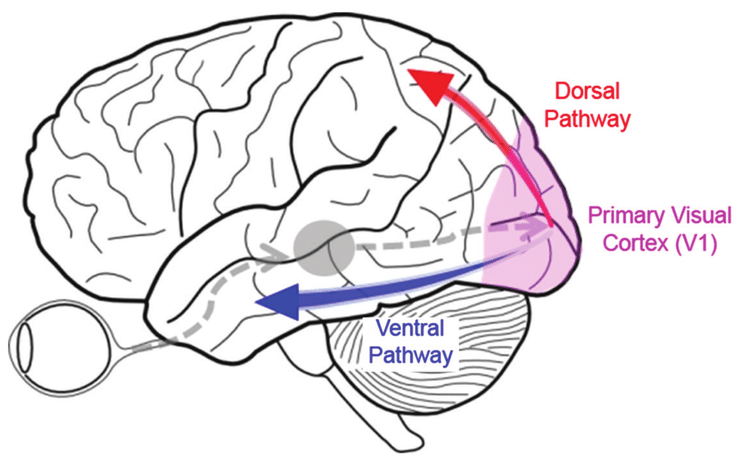 Scientists call this phenomenon “Visual Fixations”, and it’s triggered by the primary visual cortex, which is located in the very back of the brain (see image below).