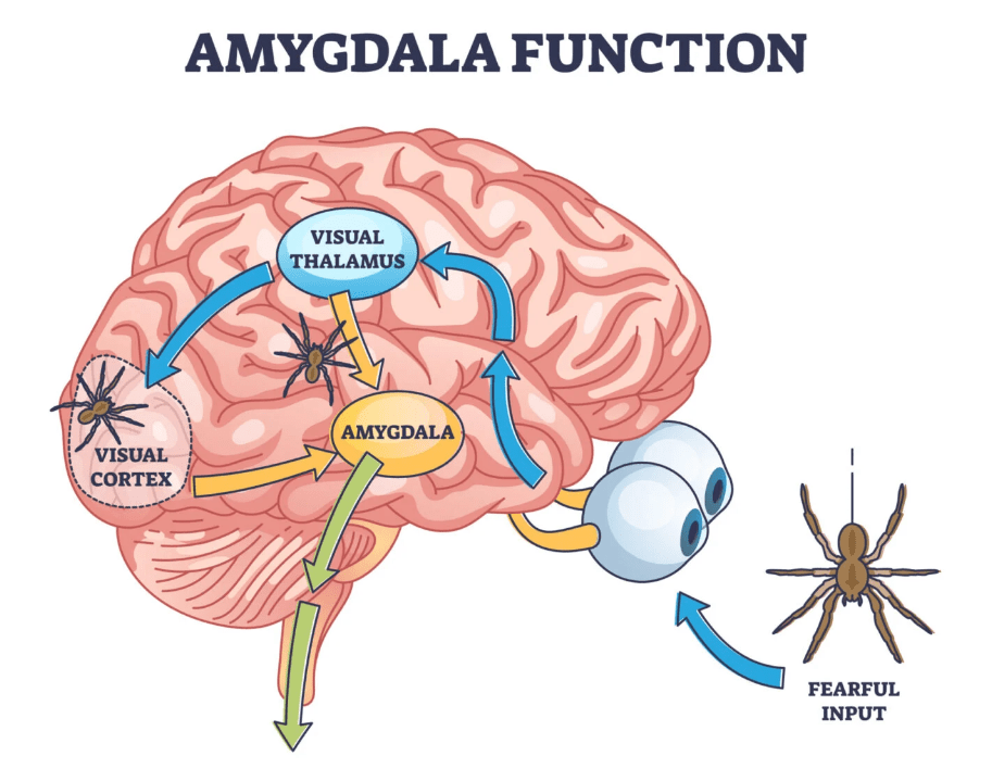 Emotions are generated and controlled within an area of the brain called the amygdala (see image below), which decides what emotion to feel and how to react to stimuli without any conscious procession or decision-making whatsoever (you can see below that the frontal lobe isn’t even involved in the pathway!), which is why emotions like fear can often be completely irrational.