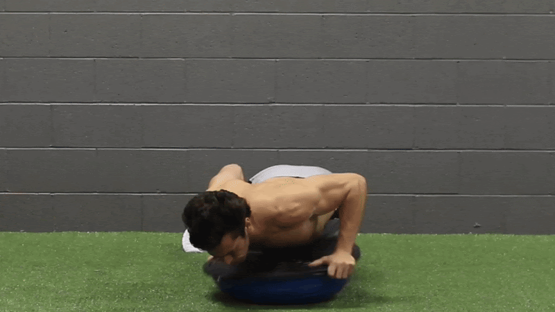 The Bosu ball itself is fun but isn’t necessary. You can perform the same exercise by just rotating the position of your hands directly on the ground. Either way though, be sure to EXPLODE up off the ground as hard as you can! Think of trying to lift your chest as high up off the ground as possible with each rep.