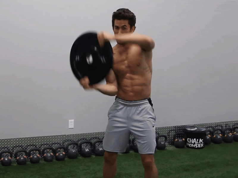 It’s performed by holding the edges of a plate (or the ends of a dumbbell if you don’t have a plate… although a plate is ideal), and starting with the plate held down and out to the side. Then you’ll bring the plate up and across your body, then circle the plate behind your head, and back down to the opposite side… then reversing that motion in the opposite direction!