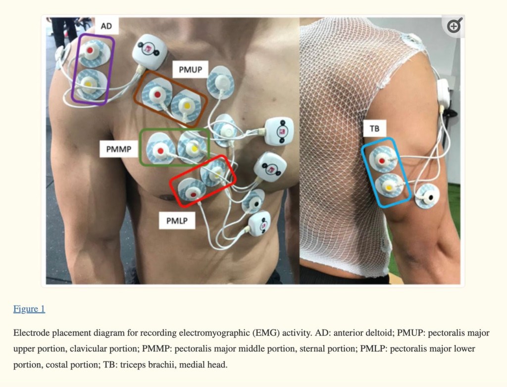 A well-designed 2020 research study set out to discover the answer by hooking participants up with electrodes (see image below), and then having them perform a bench press using their 1 rep maximum weight at five different angles: 0°, 15°, 30°, 45°, and 60°.