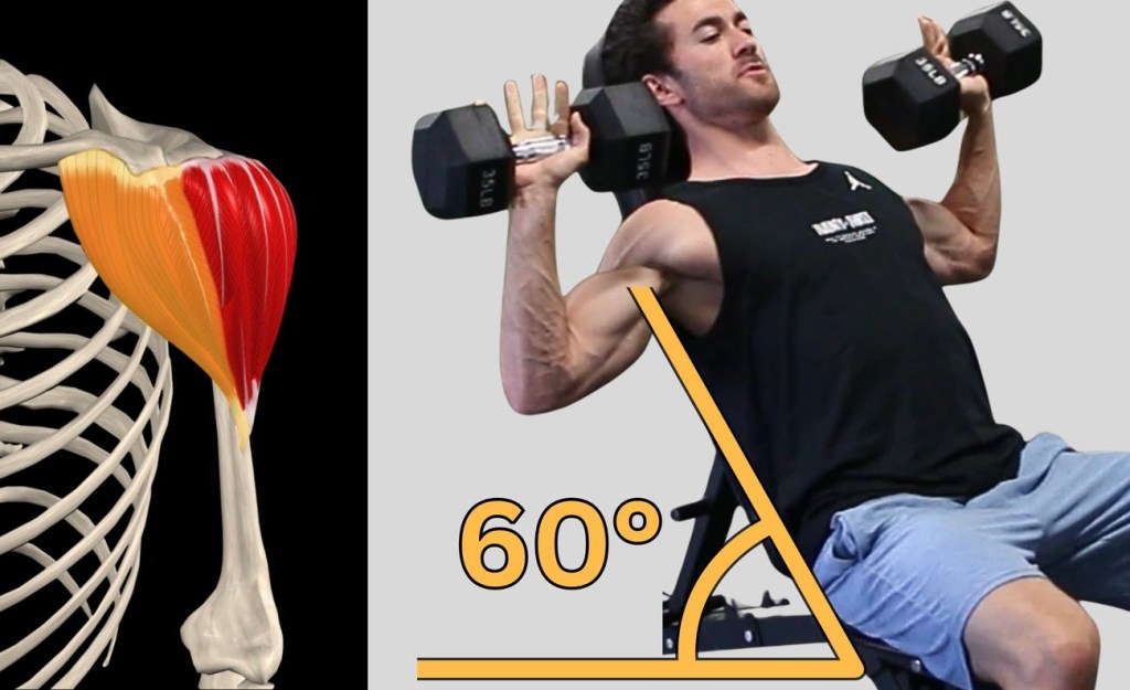 While maximum activation of the FRONT DELT occurrs when the bench is set to the relatively higher angle of 60° (the precise angle shown in the image below) — twice the degree of incline that favors the upper chest.