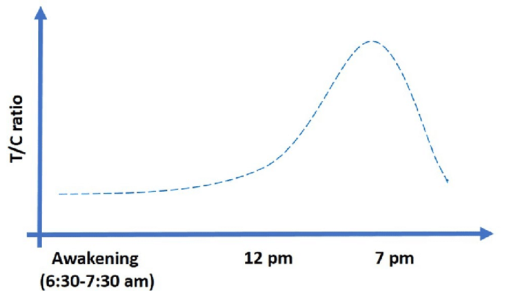 So how much testosterone you have that ISN’T being counteracted by cortisol is significantly higher in the afternoon and evening than it is in the morning!
