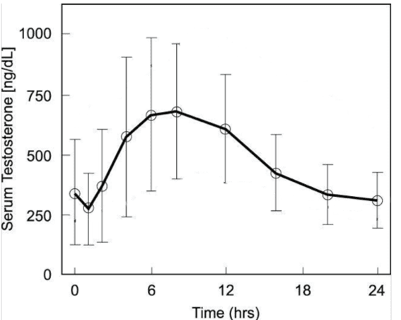 Your testosterone levels fluctuate in a “circadian rhythm”, where they’re highest in the morning, as shown in the following graph: